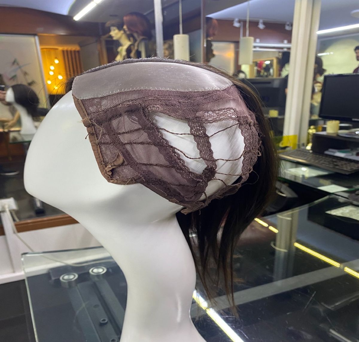 Cabe aclarar que la peluca está compuesta, no solo por la base de proletano, sino que está integrada por un gorro tejido, el cual tiene intersecciones, en donde se adhiere más cabello. Es necesario que los mechones de cada confluencia midan exactamente lo mismo. Es decir, si en la primera intersección se ponen mechones de 30 centímetros, en los encuentros restantes, se debe poner ese mismo largo. Buscan darle un estilo de “capas”, para que la peluca tenga el efecto de un pelo que nace en diferentes partes, para que se vea más real. Katherine Castro está a cargo del tejido del cabello de cada tira de pelo, que luego será unida a cada intersección del gorro. Sobre 3 hilos ampliamente estirados, hace amarres en forma de M, de unos cuantos mechones de pelo que son unidos gracias a la presión que se realiza. Castro, dice que cada tira se demora aproximadamente 2 horas, pero eso depende del largo que se va a realizar.