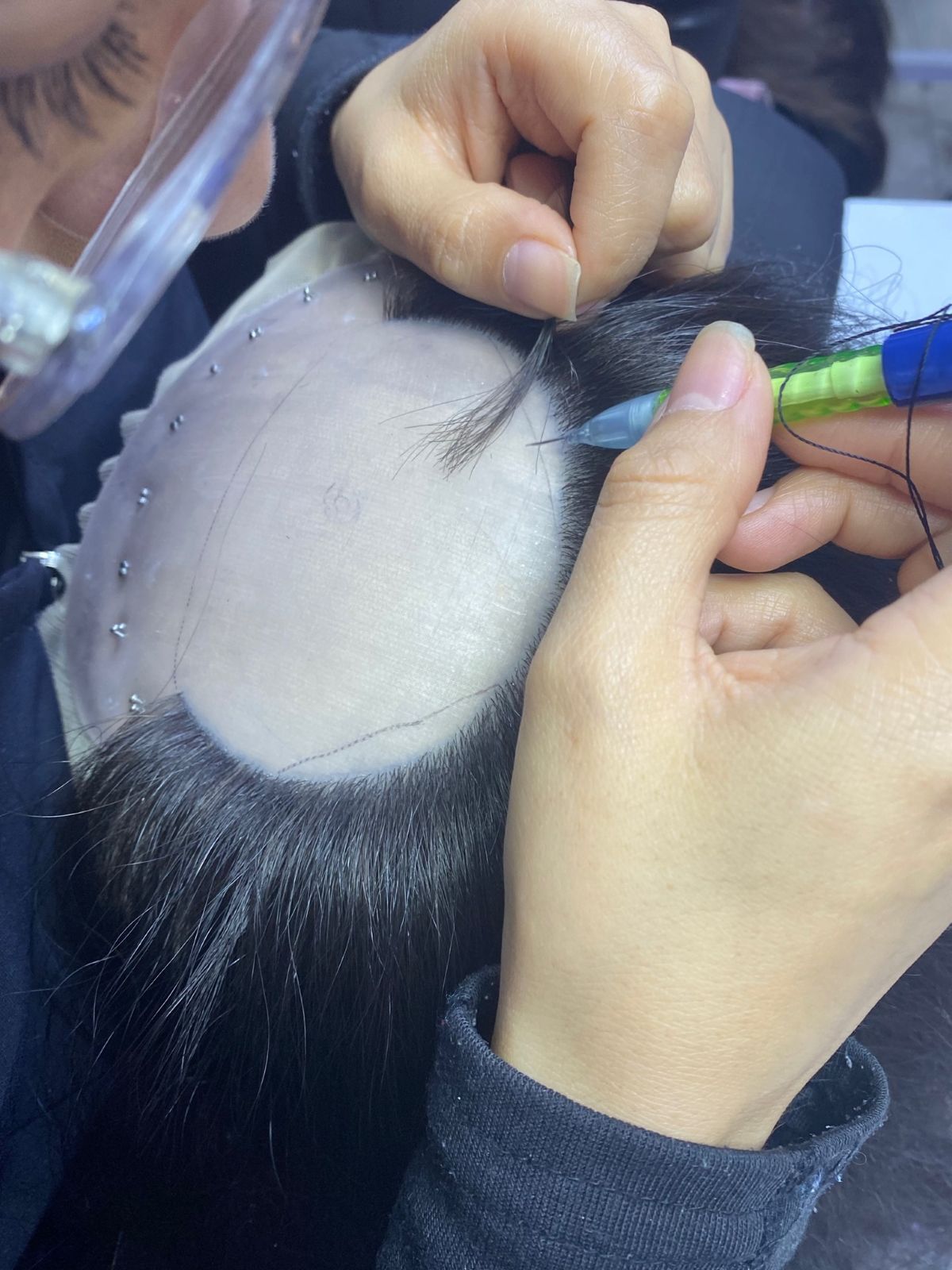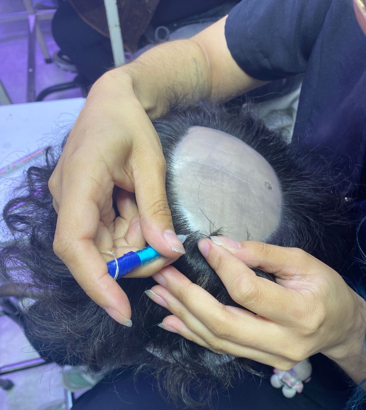 Después de la elección, viene la etapa quirúrgica. El trabajo que se realiza en este punto requiere de precisión máxima. La inyección del pelo en la base de proletano se hace cabello por cabello. El proceso busca insertar individualmente cada uno de ellos, para darle más realismo a la peluca. Katherine Ortega, quien realiza este trabajo comenta que “este proceso puede demorar, en promedio, de 1 a 2 días, máximo 3”. Sus dedos sostienen unos cuantos cabellos que, uno a uno, son arrastrados con la punta de la aguja para ser inyectados en la base seleccionada. Karen García, quien también hace la inyección de pelo, considera que, “para este trabajo , se necesita mucha paciencia y dedicación”. Katherine Ortega y Yeimy Malagón, quienes componen el equipo que ejecuta este milimétrico trabajo, están de acuerdo al decir que no todos pueden hacer lo que ellas hacen y que su trabajo se compone en suplir una necesidad, para que las personas recuperen su imagen y su confianza.