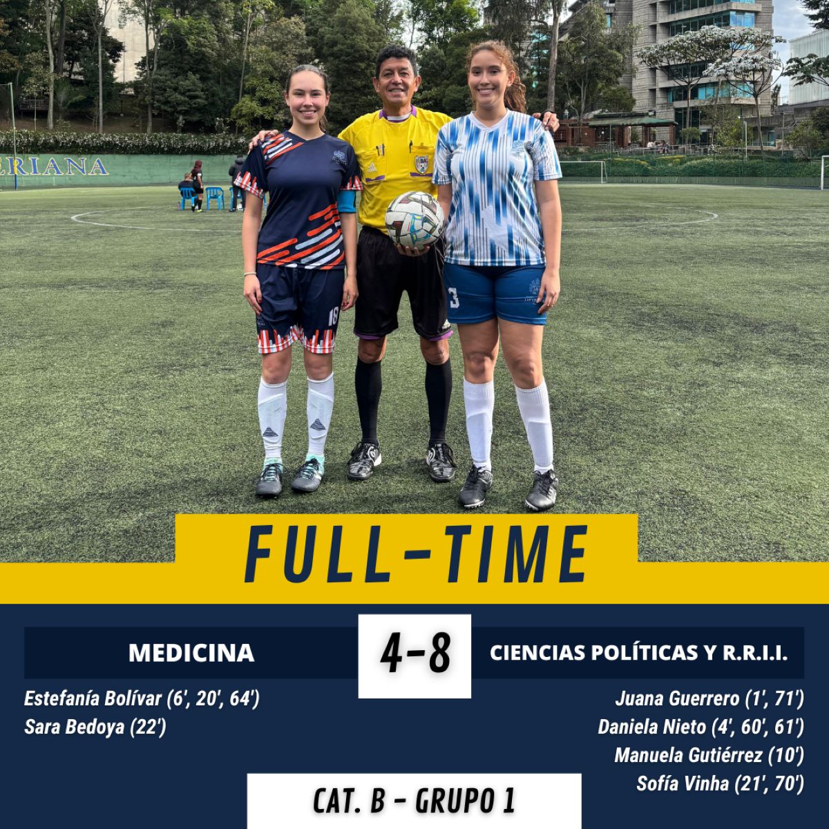 Medicina reaccionó al 6:31 con Estefanía Bolívar (#1), que avanzó por la banda y descontó. Sin embargo, al 10:02, Manuela Gutiérrez (#11) volvió a marcar para CPRRI con un disparo elevado que superó a la arquera.