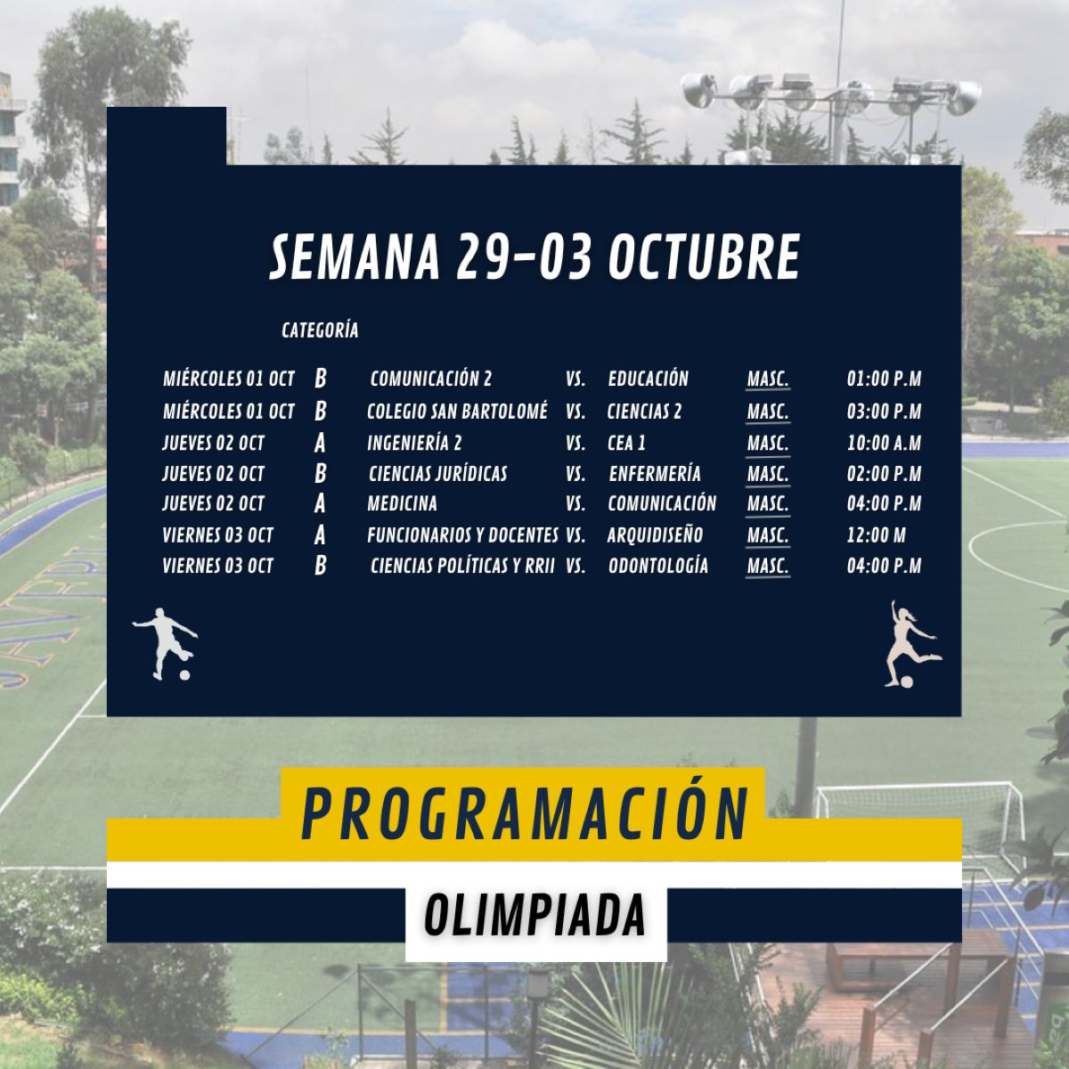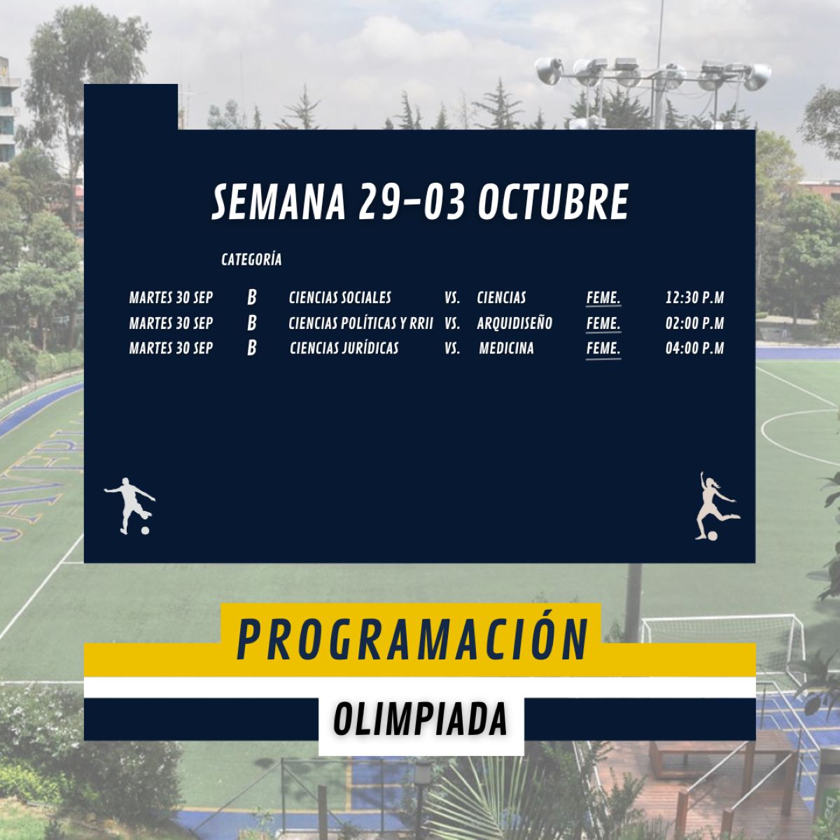 La acción de esta semana inicia el martes 30 de septiembre con 3 compromisos de la Olimpiada femenina. El balón rodará a las 12:30 P.M, con el partido entre @futbolciencias y @futbol_sociales_puj de la Categoría B. 🔥