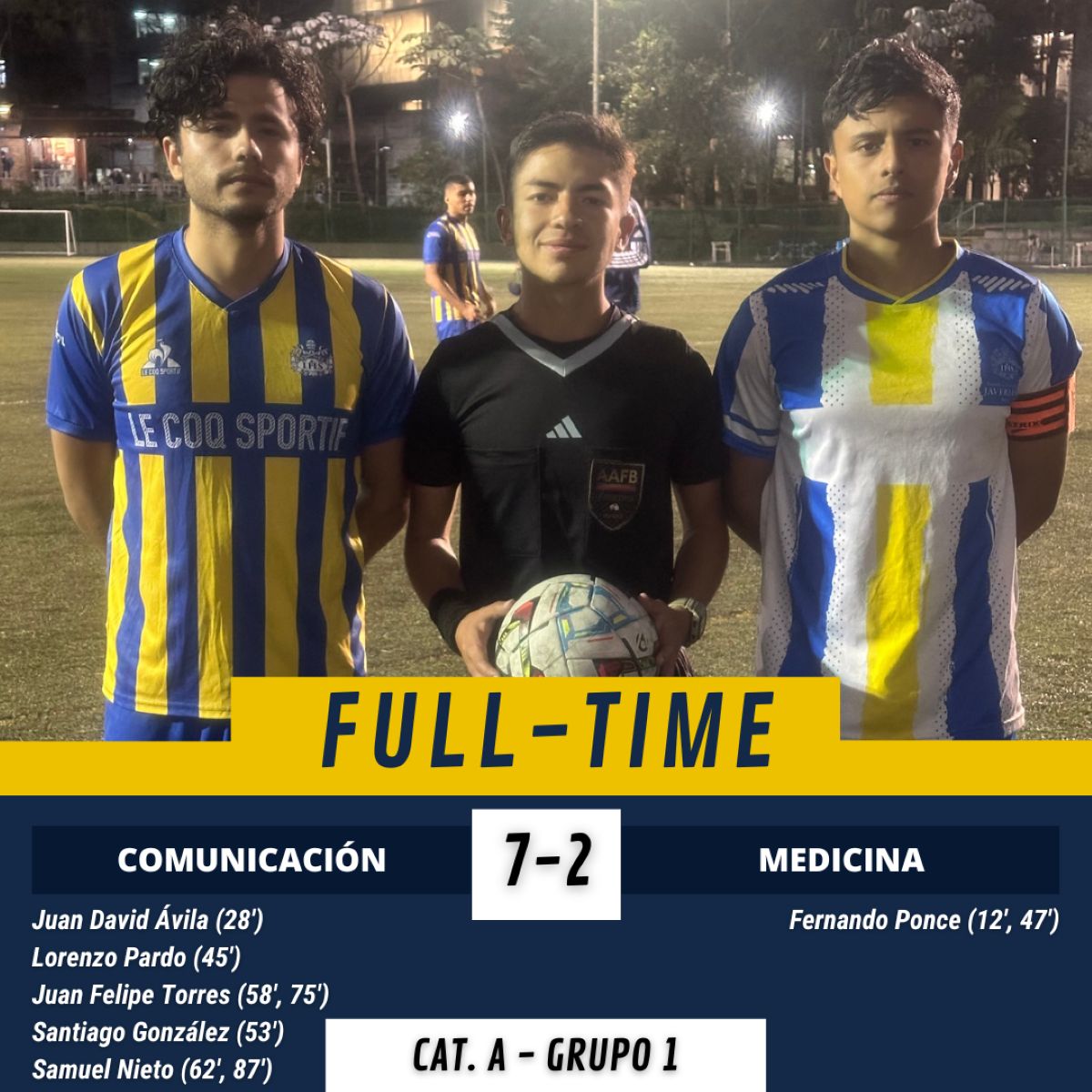 Medicina pegó primero con Fernando Ponce al minuto 12, pero Comunicación reaccionó rápido: Juan David Ávila empató al 28’ y Lorenzo Pardo, desde el punto penal al 45’, puso el 2-1 al descanso.