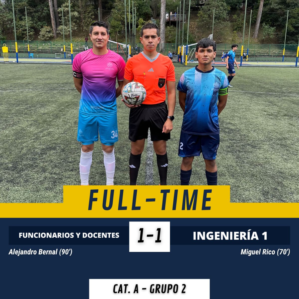 En la segunda mitad los ingenieros salieron decididos y punzantes para buscar abrir el marcador. Luego de varias llegadas, pero sin la fortuna de poder concretar, llegó al minuto 70 la primera celebración. Miguel Rico #6 cazó un balón en borde de área y sin pensarlo dos veces clavó tremendo zapatazo al ángulo superior derecho del guardameta rival que nada pudo hacer. El partido parecía definido pero, el equipo de Funcionarios y Docentes no estaba dispuesto a rendirse tan fácil. Al minuto 90 y con una anotación que sorprendió hasta al camarógrafo, Alejandro Beltrán #87, desde adelante de mitad de cancha sacó un potente disparo que colgó y dejó sin opciones al arquero de Ingeniería. El árbitro añadió 2 minutos; tiempo en el que ninguno logró decantar la balanza a su favor, dejando un emocionante 1-1 como marcador final. ⚽️🔵🟡
